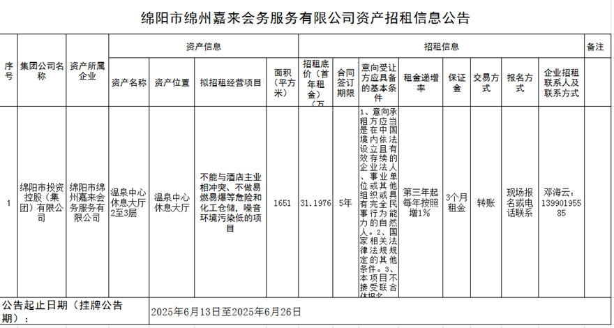 綿陽市綿州嘉來會(huì)務(wù)服務(wù)有限公司資產(chǎn)招租信息公告