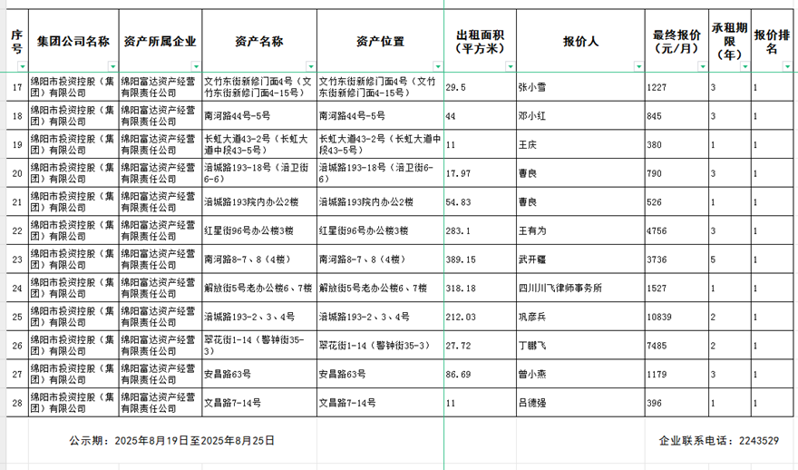 綿陽富達資產(chǎn)經(jīng)營有限責(zé)任公司出租結(jié)果公示