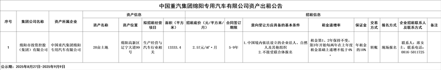中國重汽集團綿陽專用汽車有限公司資產(chǎn)出租公告