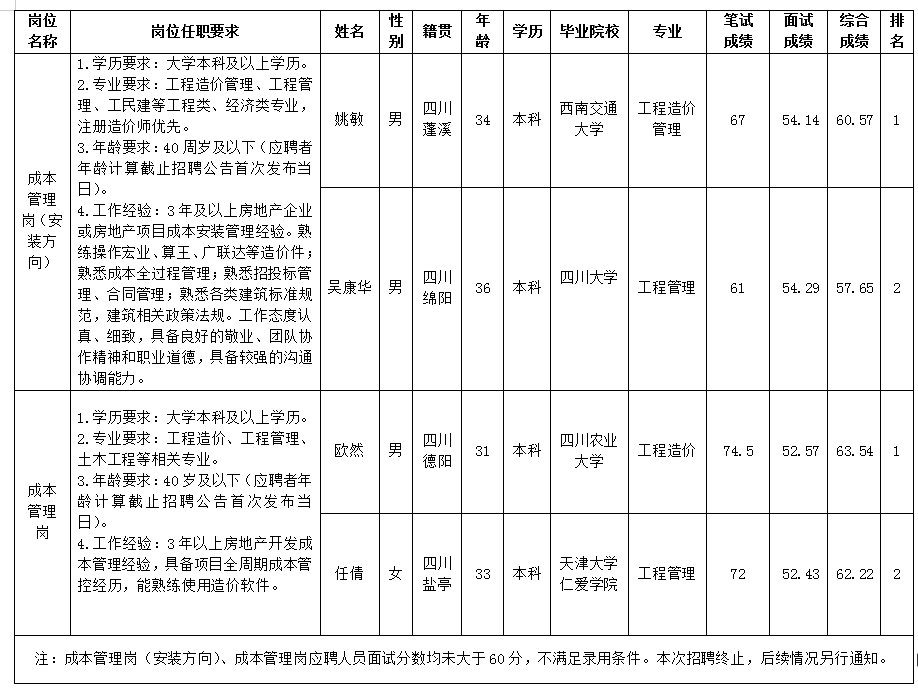 根據(jù)綿陽(yáng)市綿投置地有限公司發(fā)布的招聘公告及招聘相關(guān)規(guī)定,經(jīng)筆試、面試等程序,現(xiàn)將筆試、面試成績(jī)予以公示。
