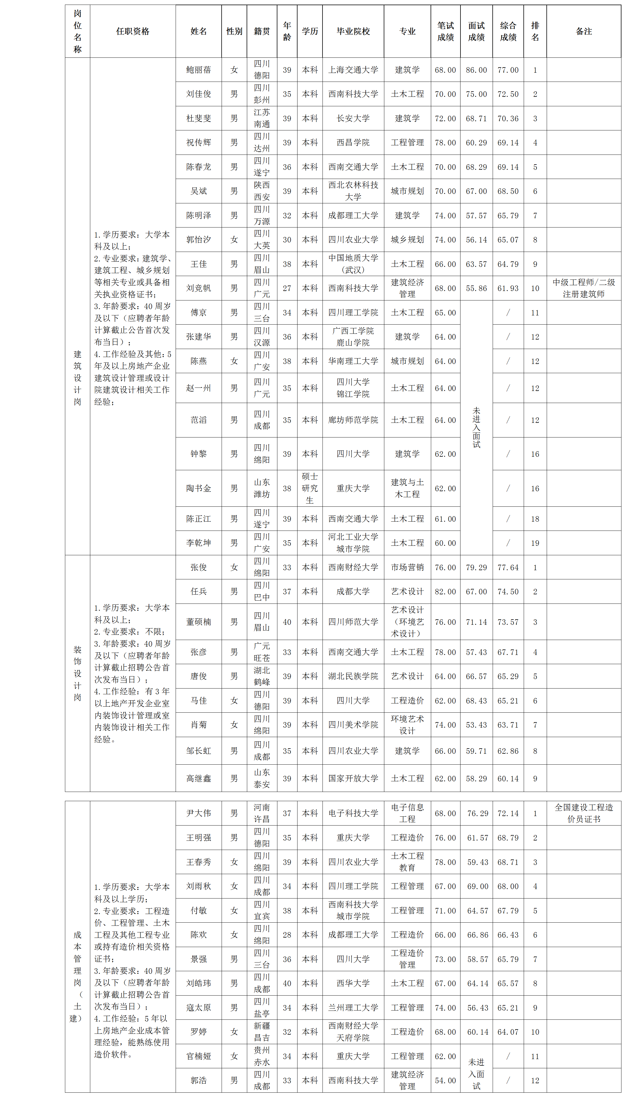 根據(jù)綿陽市綿投置地有限公司發(fā)布的招聘公告及招聘相關(guān)規(guī)定,經(jīng)筆試、面試等程序,現(xiàn)將筆試、面試成績予以公示。