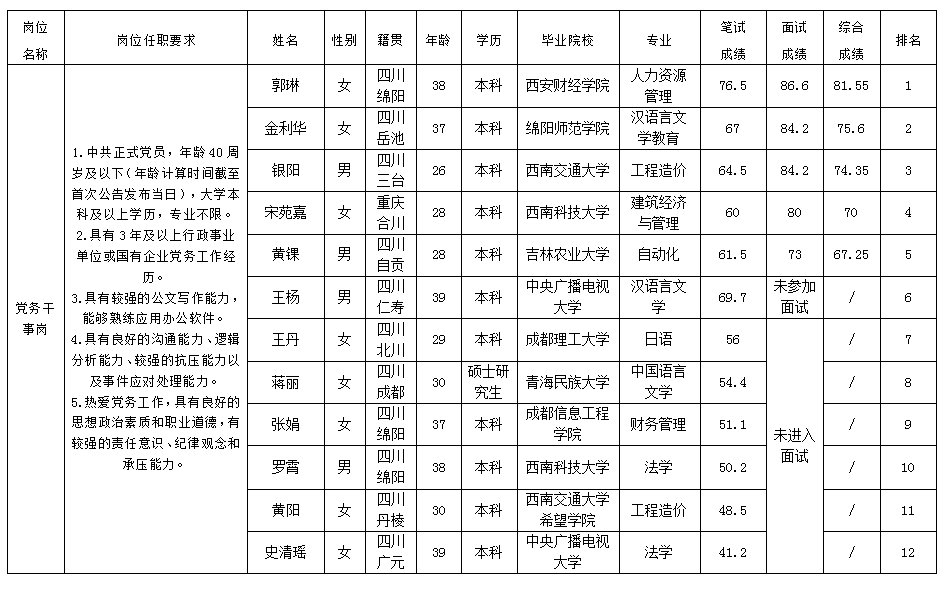 根據(jù)綿陽(yáng)市投資控股(集團(tuán))有限公司發(fā)布的招聘公告及招聘相關(guān)規(guī)定,經(jīng)筆試、面試等程序,現(xiàn)將筆試(面試)成績(jī)予以公示。