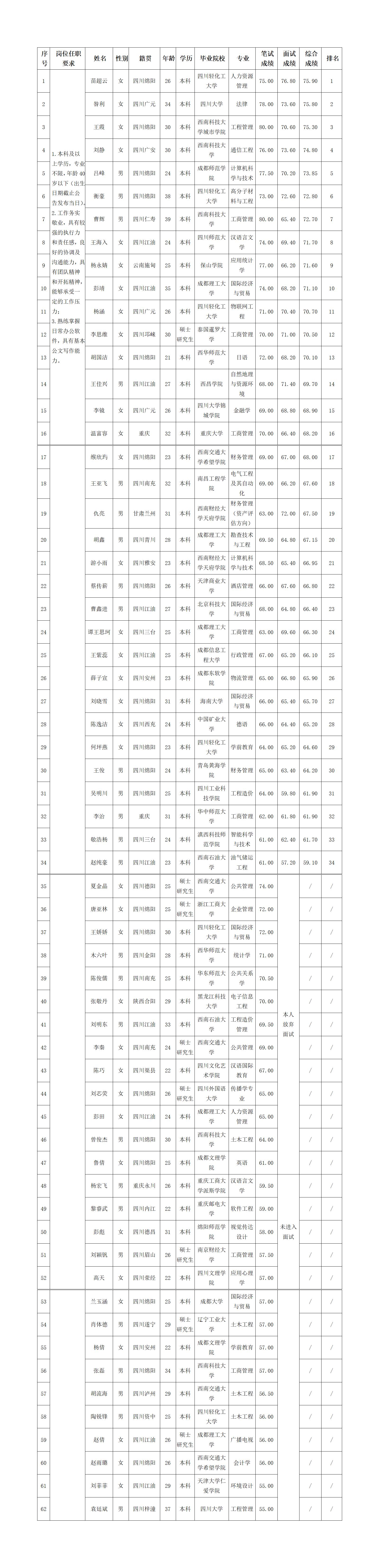 根據(jù)四川綿江能源有限公司發(fā)布的招聘公告及招聘相關(guān)規(guī)定,經(jīng)筆試、面試等程序,現(xiàn)將筆試、面試成績予以公示。
