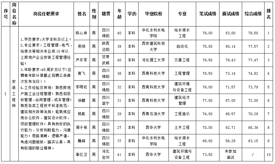根據綿陽市綿投置地有限公司發(fā)布的招聘公告及招聘相關規(guī)定,經筆試、面試等程序,現將筆試、面試成績予以公示。