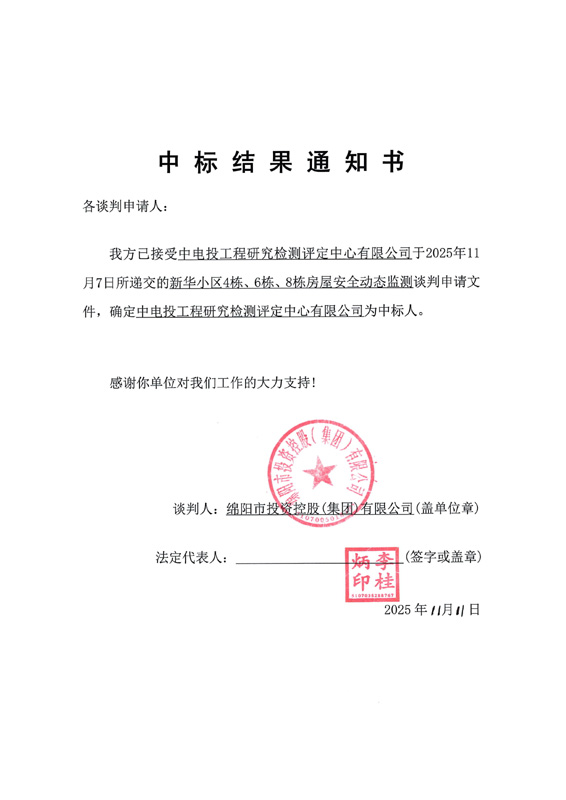 新華小區(qū)4棟、6棟、8棟房屋安全動態(tài)監(jiān)測中標結(jié)果通知
